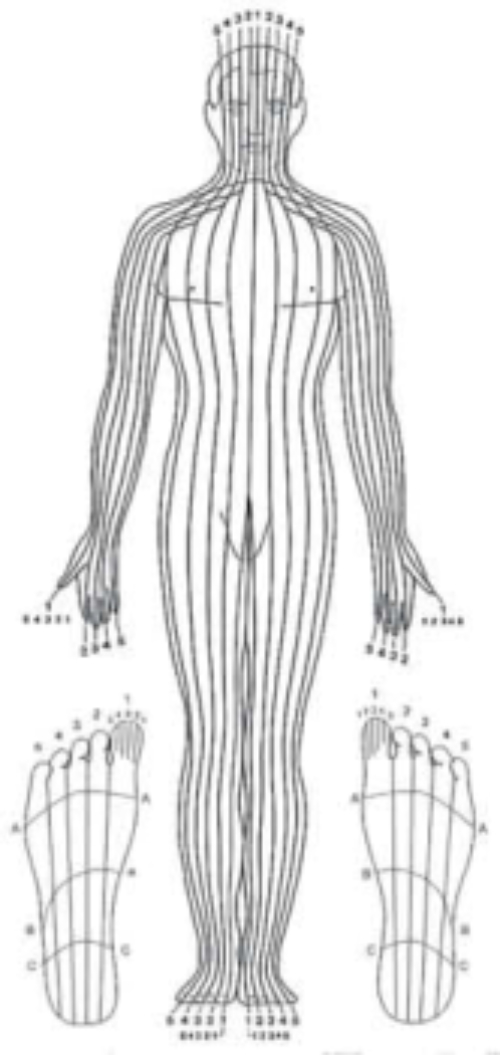 eeuw ontwikkeld door de KNO-arts dr. William Fitzgerald. Hij deelde het lichaam in tien verticale zones in. Volgens