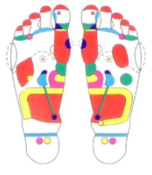 reflexpunten op de voet. Door het uitoefenen van druk op deze reflexpunten worden de bijbehorende delen van het